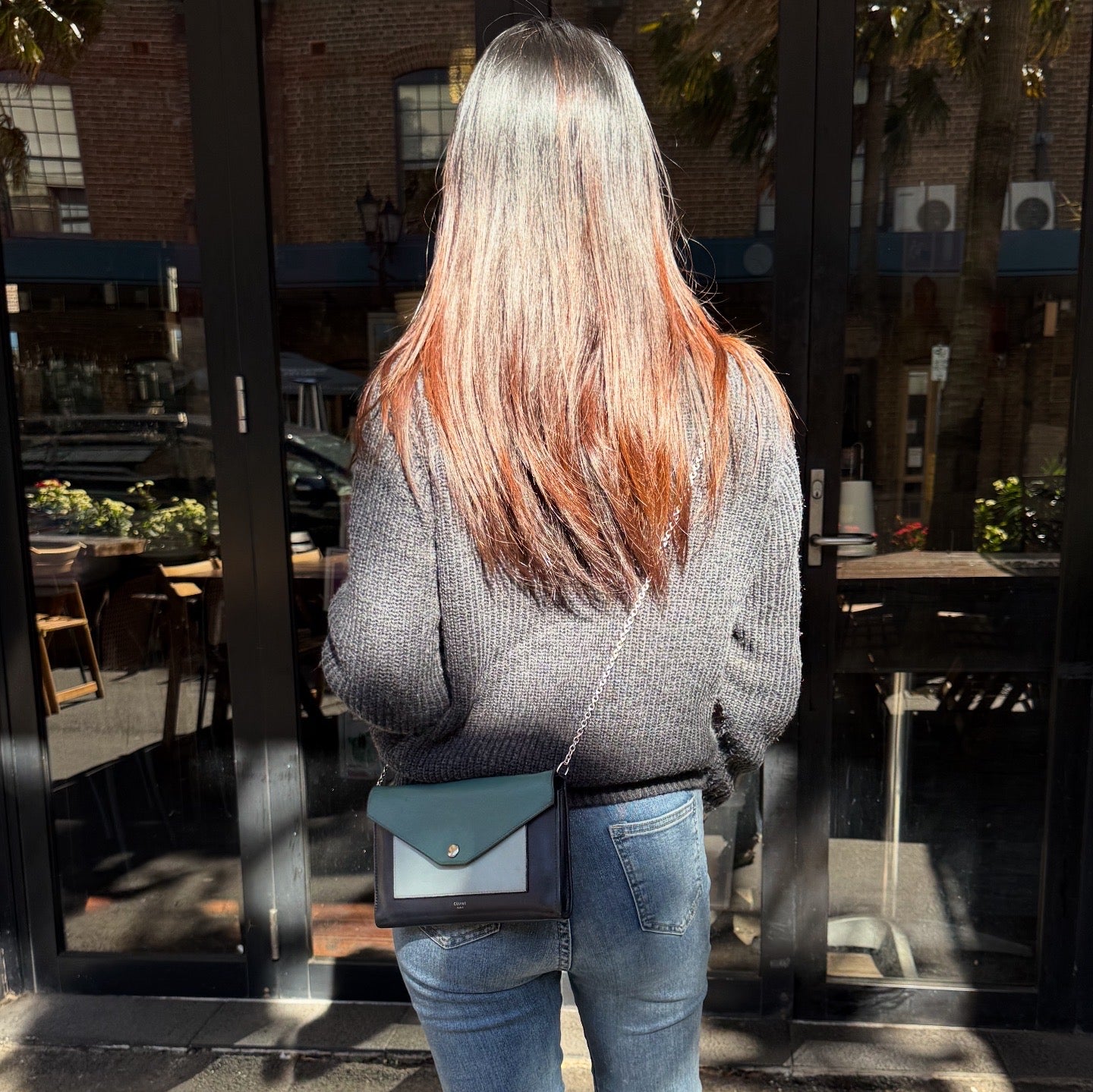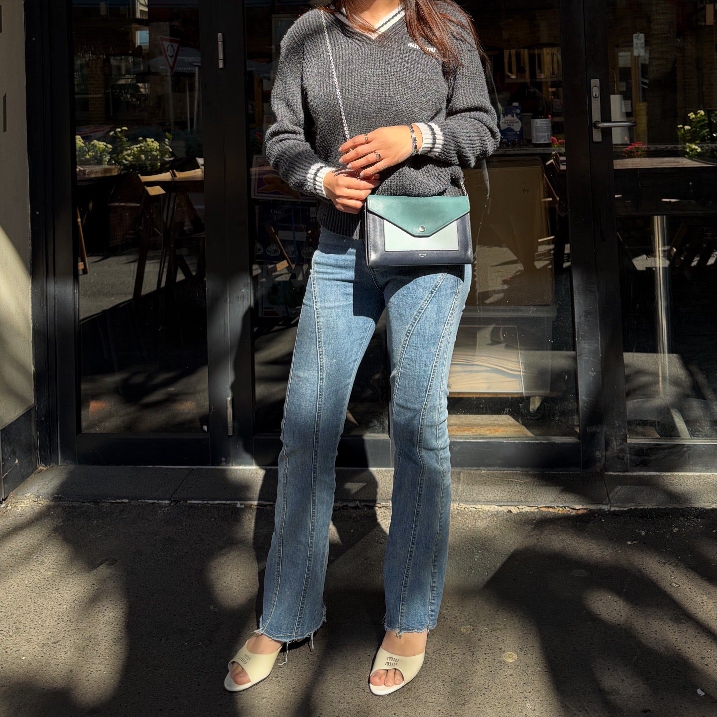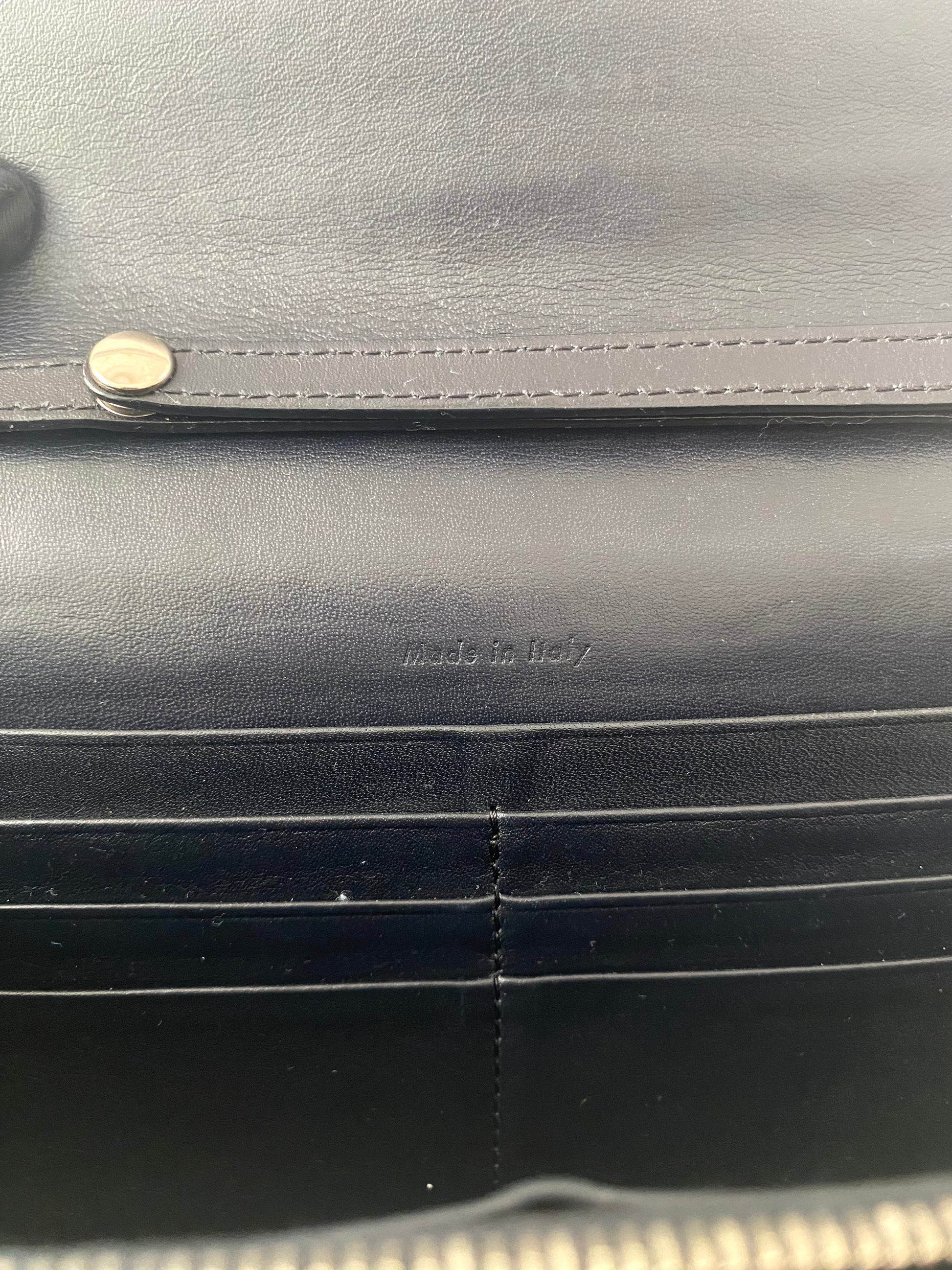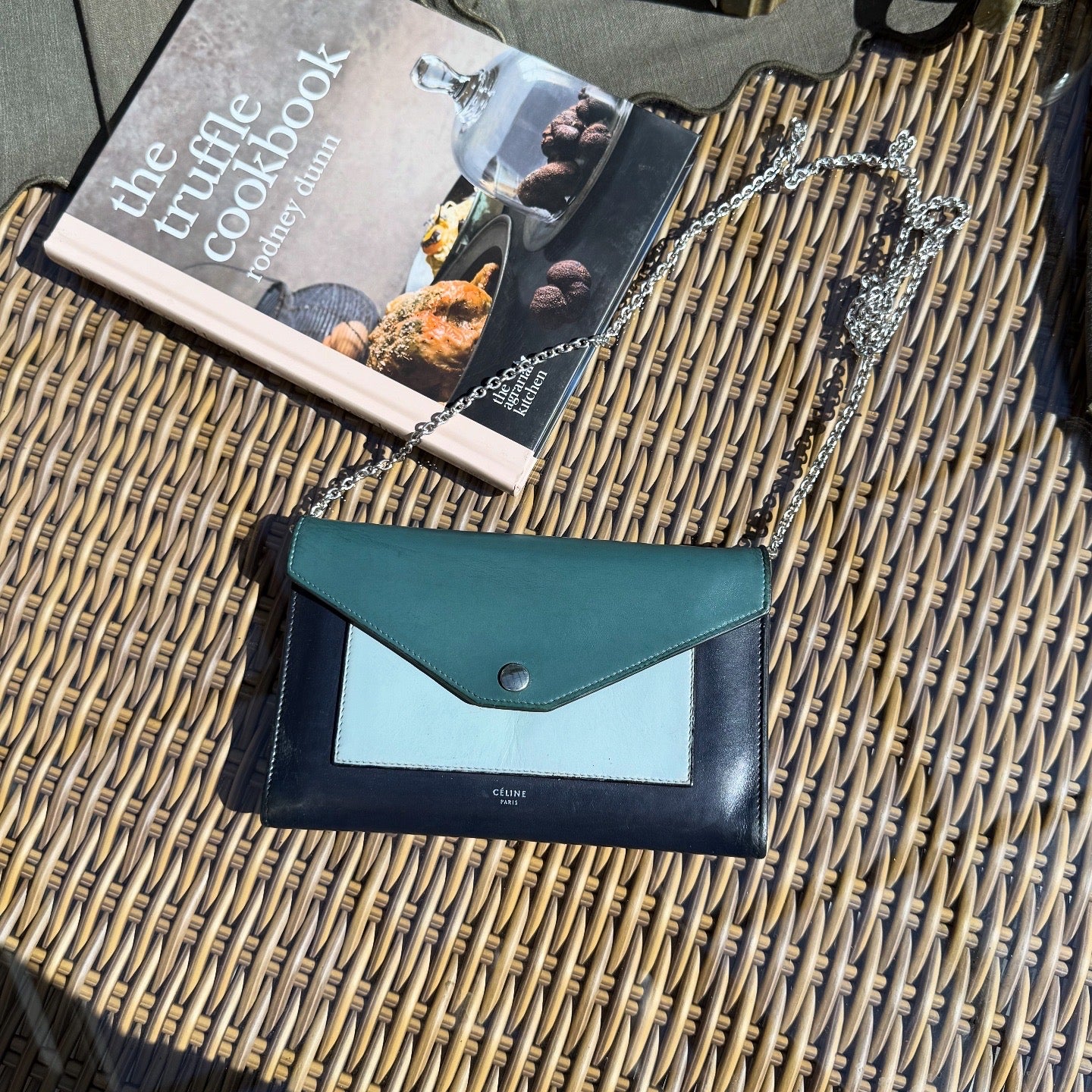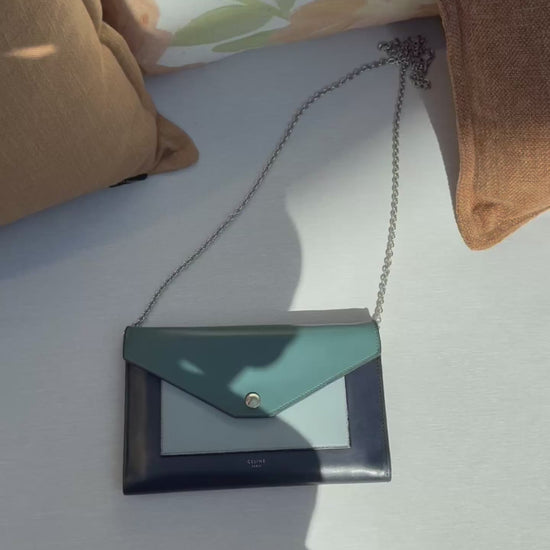 The Celine Leather Pocket Envelope Flap Bag is a minimalist yet elegant accessory, designed by Phoebe Philo. Its clean lines and envelope silhouette make it a timeless piece suitable for various occasions. The bag features a flap closure with a snap button, a detachable chain strap, and gold-tone hardware.