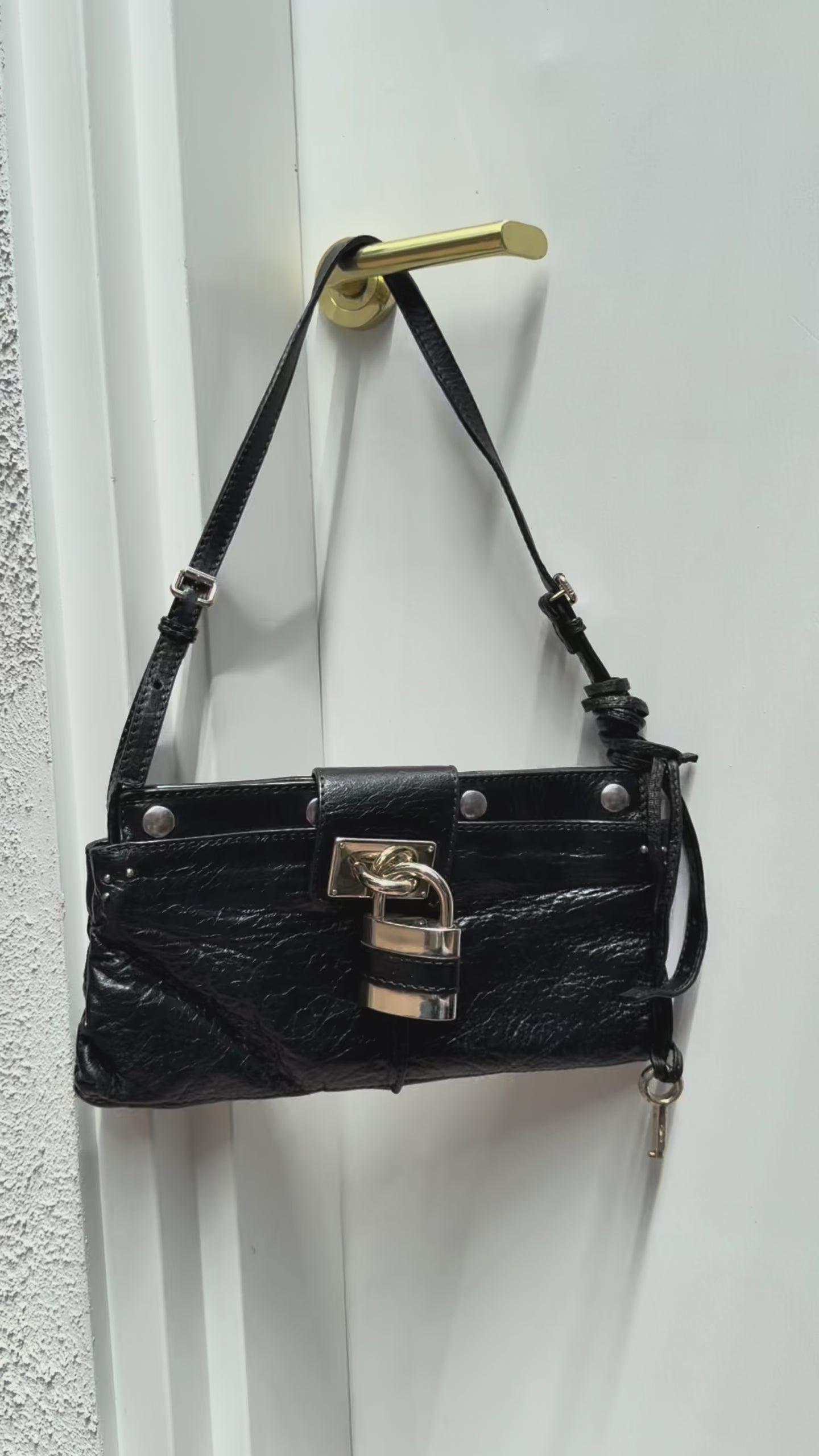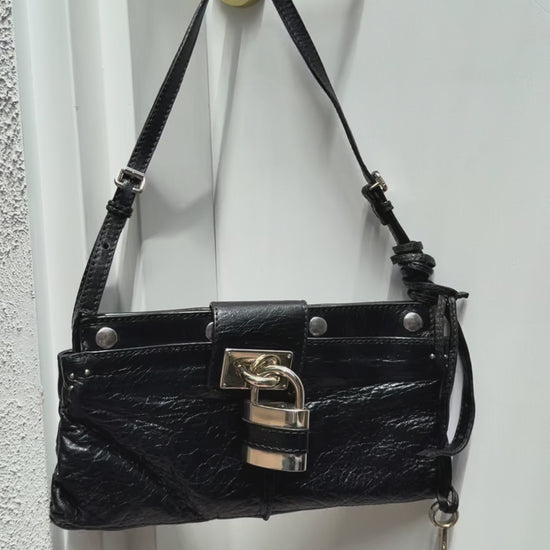 The Paddington shoulder bag features a leather body, a flat strap, a silver-tone padlock detail, a top zip closure, and an interior zip pocket.