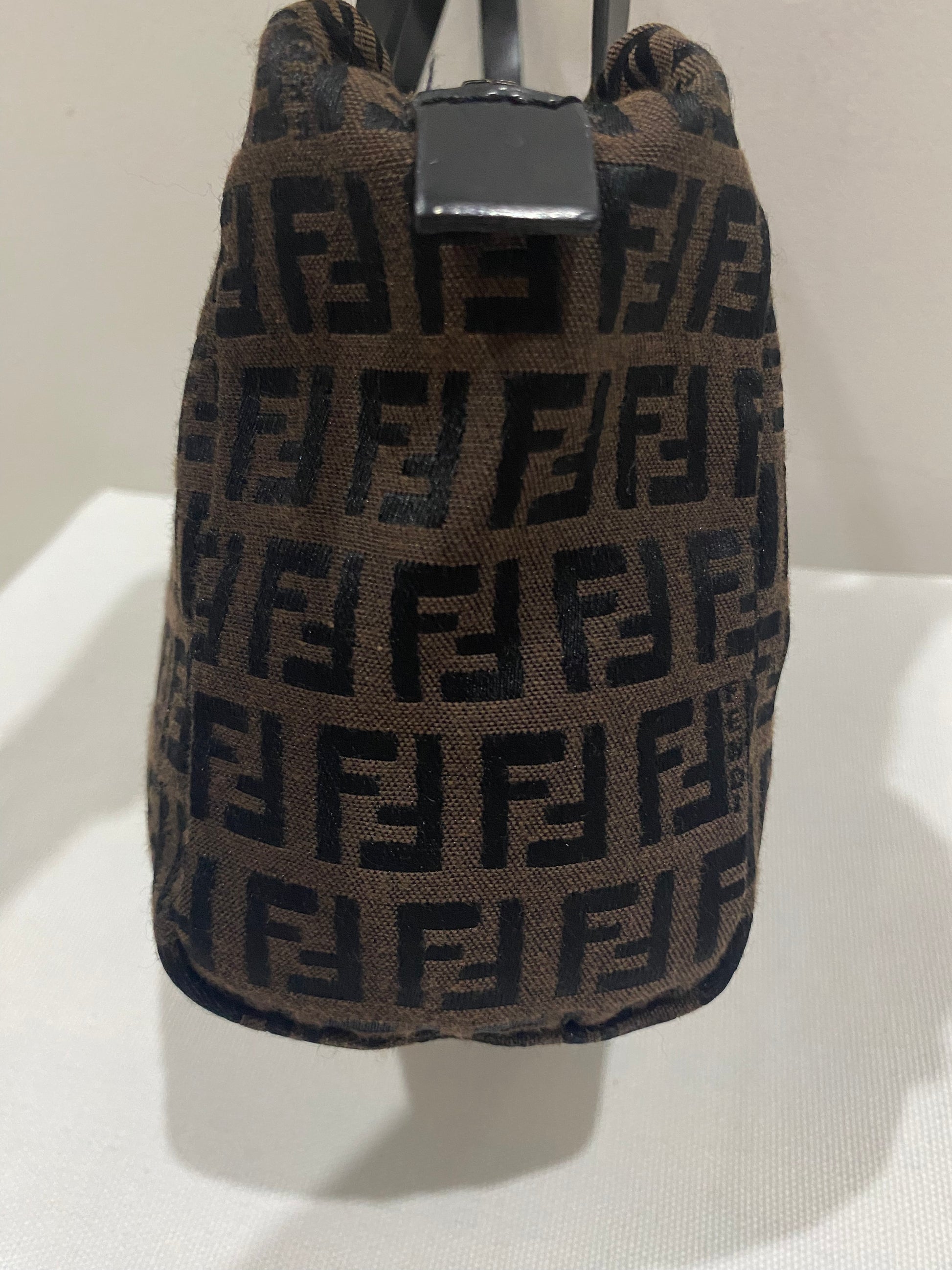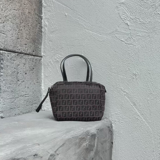The Fendi Mini Zucchino Chocolate Bag is a charming and compact accessory from Fendi's iconic Zucchino collection. Its distinctive brown FF monogram canvas, paired with sleek leather accents, offers a versatile style suitable for various occasions.