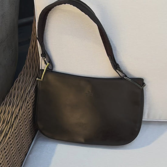 Elevate your style with this iconic Gucci shoulder bag in rich dark chocolate leather. Crafted for both elegance and everyday wear, it features a sleek silhouette and durable handles in excellent condition. The leather shows natural character marks, adding to its authentic, pre-loved charm. Perfect for work, evenings out, or any occasion where luxury meets practicality.