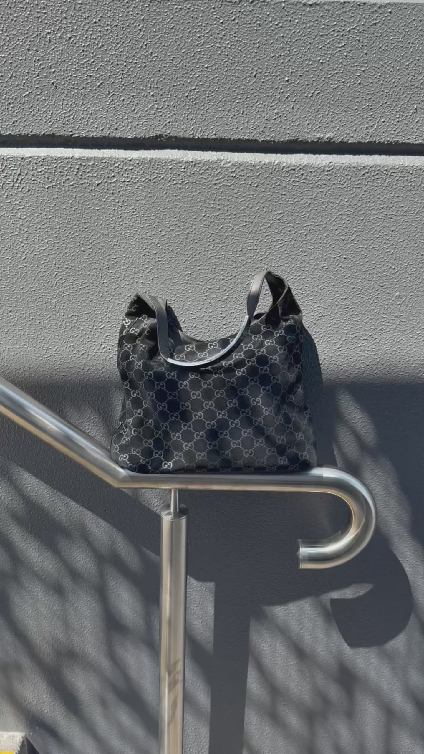 Black monogram suede exterior trimmed with a black leather shoulder strap with a gunmetal engraved curved strap top. Snap closure opens to a black nylon lined interior that holds ample storage space and a side zippered pocket for added organization.