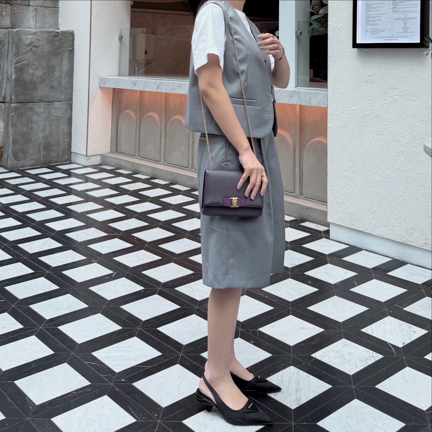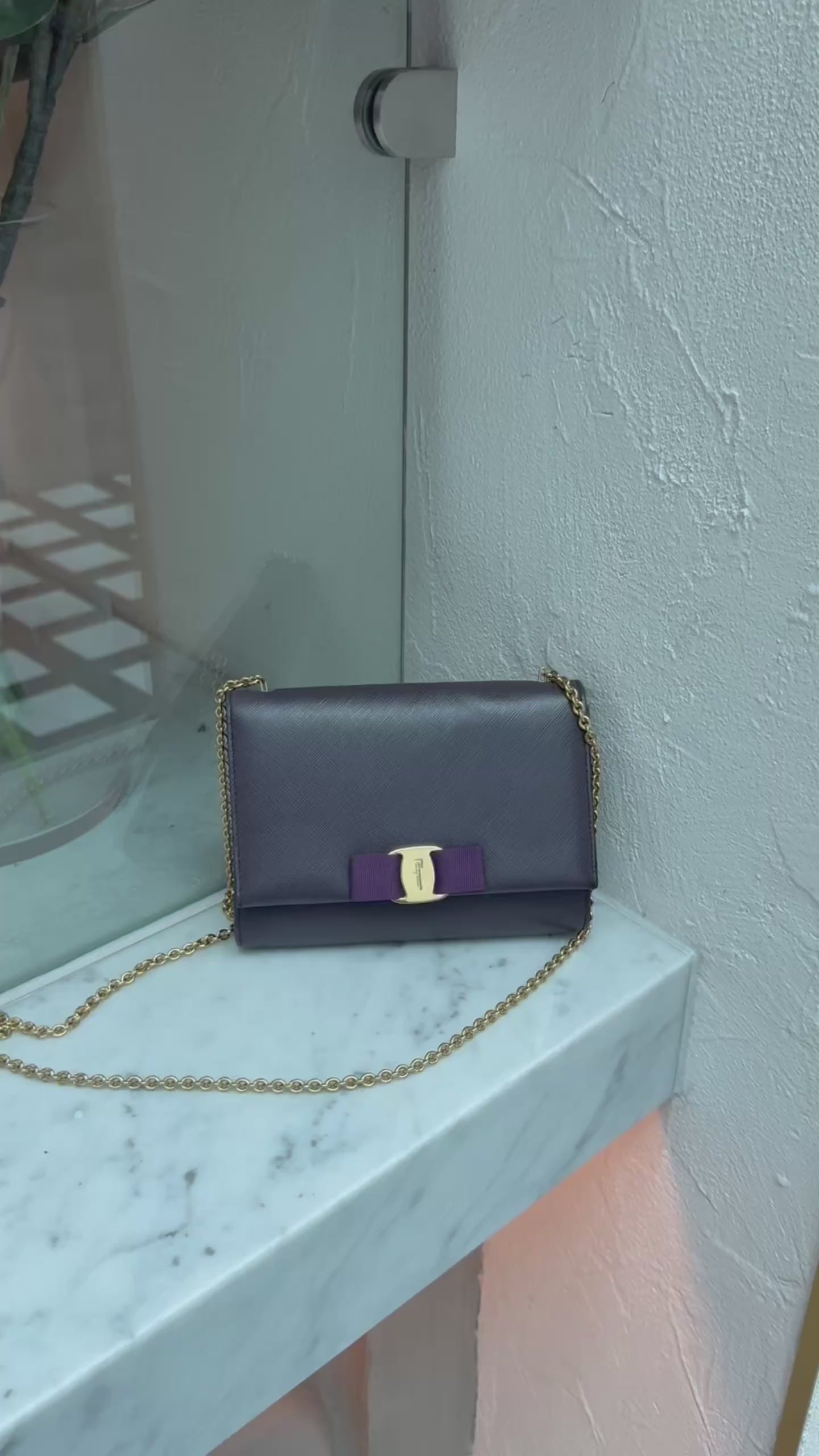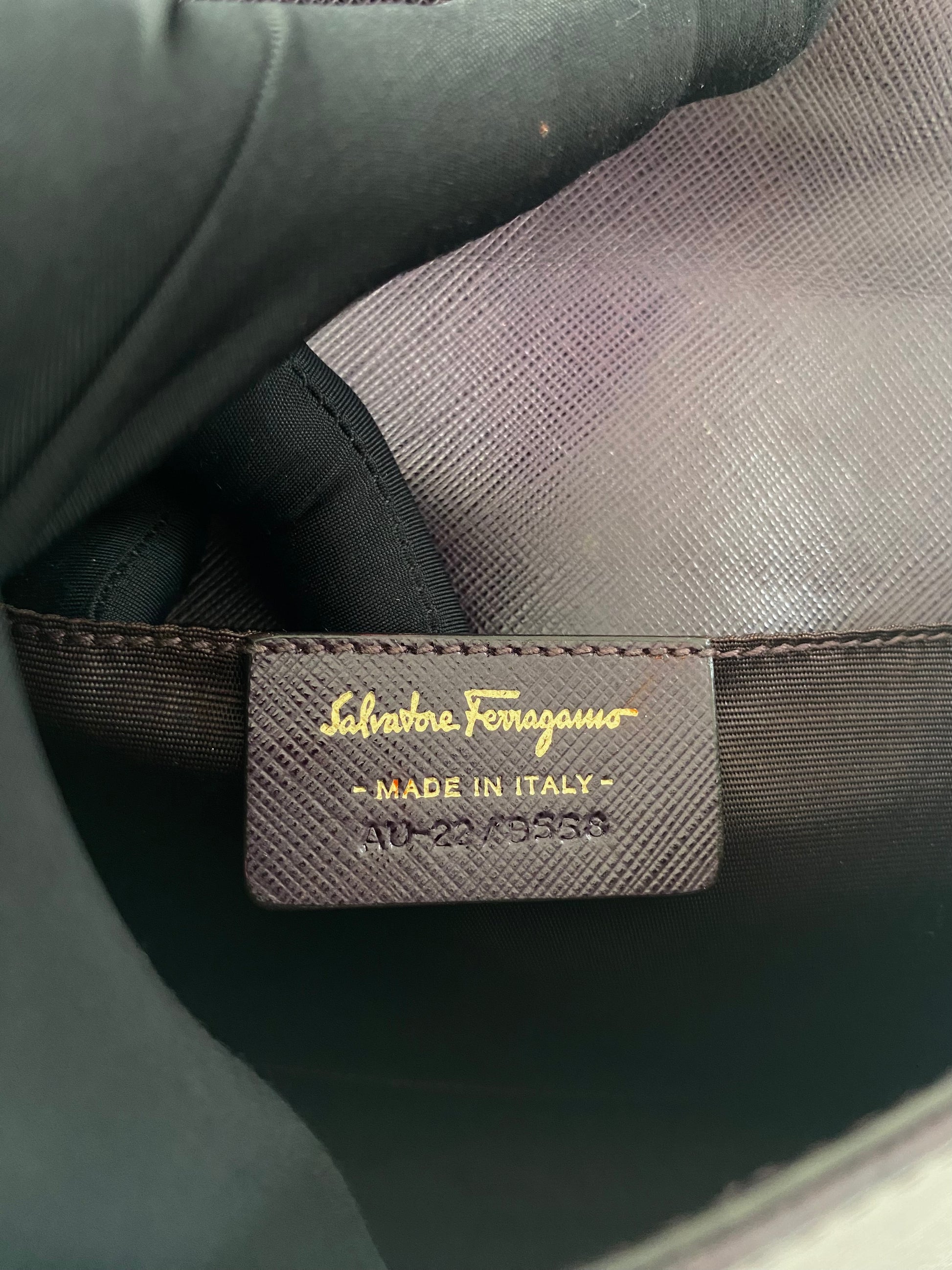 Crafted in luxurious saffiano leather, the Ferragamo Genie Bag showcases a rich purple hue accented with elegant gold-tone chain straps. Designed for versatility, it can be worn as both a shoulder bag or crossbody, making it perfect for day-to-night styling. The structured silhouette, refined detailing, and timeless Italian craftsmanship elevate it as a true statement accessory.